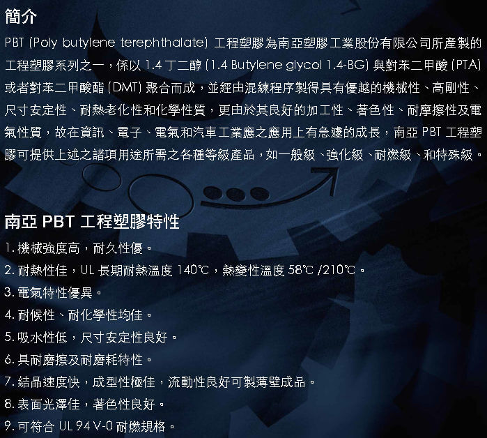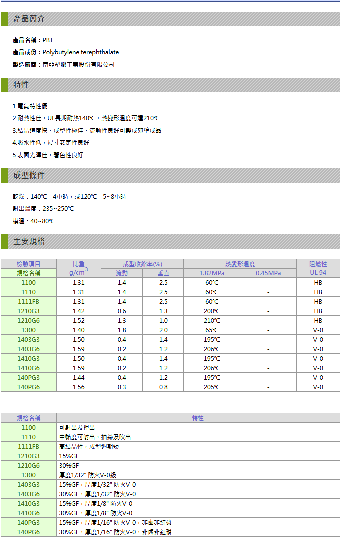 南亚NANYA聚酯系列PBT塑料 你要找的型号就在下面:(请用Ctrl+F键查找牌号更快捷)
