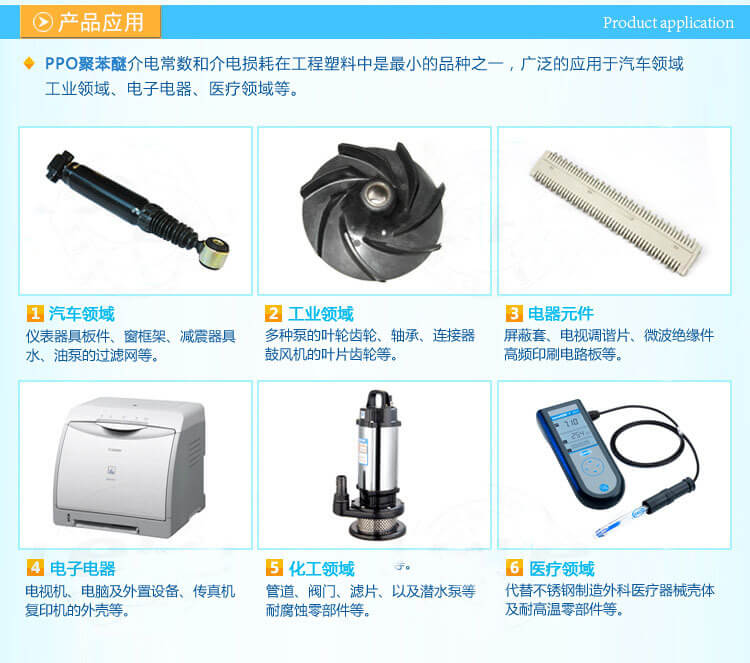 一般呈土黄色粉末状。常用的是由 2,6-二甲基苯酚合成的聚苯醚,具有优良的综合性能,特点是在长期负荷下,具有优良的尺寸稳定性和突出的电绝缘性,使用温度范围广,可在-127~121℃范围内长期使用。具有优良的耐水、耐蒸汽性能,制品具较高的拉伸强度和抗冲强度,抗蠕变性也好。此外,有较好的耐磨性和电性能。主要用于代替不锈钢制造外科医疗器械。在机电工业中可制作齿轮、鼓风机叶片、管道、阀门、螺钉及其他紧固件和连接件等,还用于制作电子、电气工业中的零部件,如线圈骨架及印刷电路板等。1964年,美国通用电气公司首先用2,6-二甲基苯酚为原料实现聚苯醚工业化生产。1966年,通用电气公司又生产了改性聚苯醚(MPPO)。1984年,世界聚苯醚的消费量为163kt。