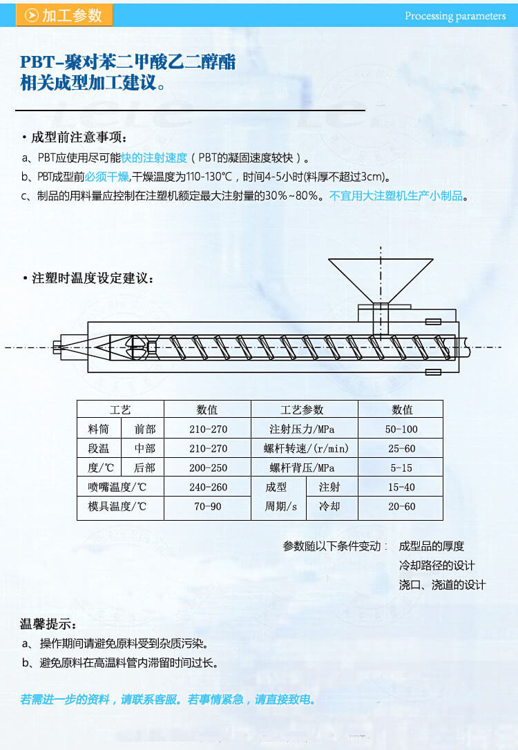 聚对苯二甲酸乙二醇酯CRASTIN美国杜邦PBT树脂注塑之前一定要在110~120℃的温度下干燥3小时左右,成型加工温度为250~270℃,模温控制在50~75℃为宜。因该料从熔融状态一经冷却,则会立即凝固结晶,故其冷却时间较短;若喷嘴温度控制不当(偏低),流道(水口)易冷却固化,会出现堵嘴现象。若料筒温度超过275℃或熔料在料