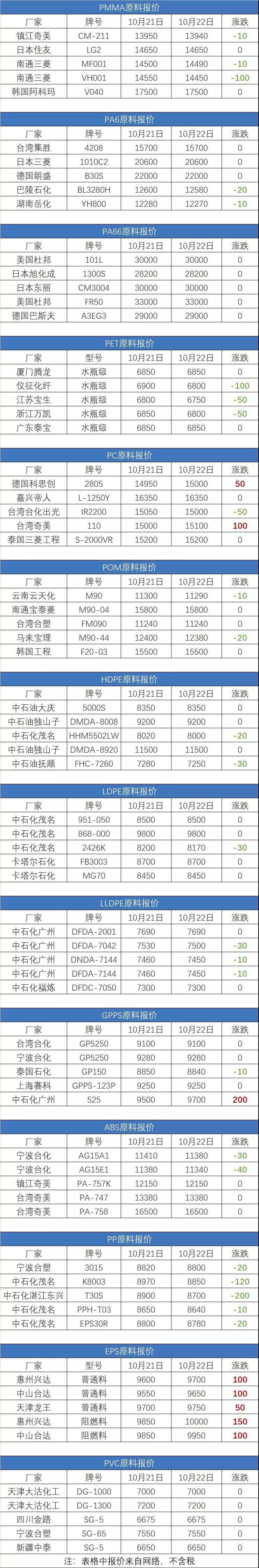 ABS塑胶原料:原油价格走势下滑,三大原料价格下跌,现货交投清淡,部分商家继续小幅让利出货。主流市场货源成交小单为主,中小下游工厂倾向于现用现采,货源成交迟缓。华南地区台湾奇美757报价11900元/吨。(未含税)