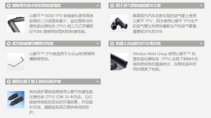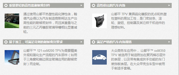 山都平 TPV 通过部件之间的外观协调、舒适触感内饰表层和很好的表层品质提高汽车内饰的美观性,吸引了用户并带来颇具成本效益的市场价值。外观精美且坚固耐用的特点来自于: